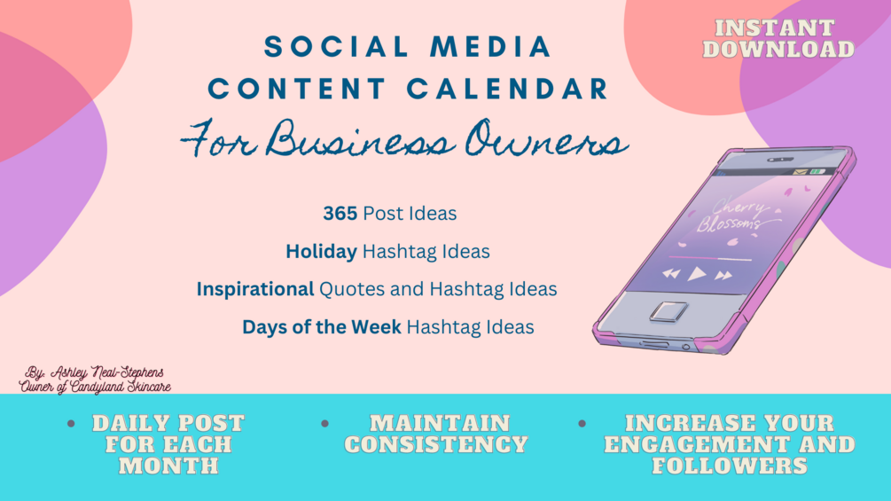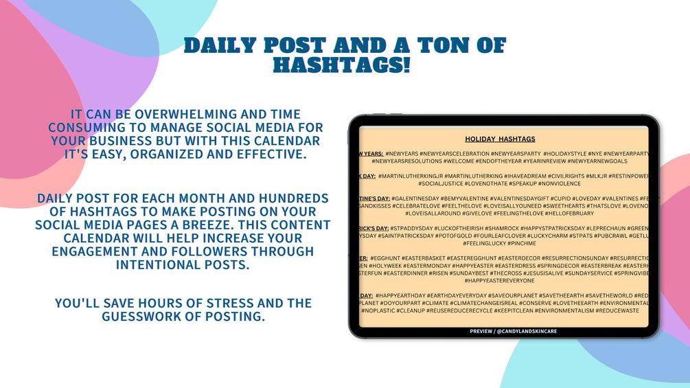 Daily post for each month and hundreds of hashtags to make posting on your social media pages a BREEZE. This content calendar will help increase your engagement and followers through intentional posts.