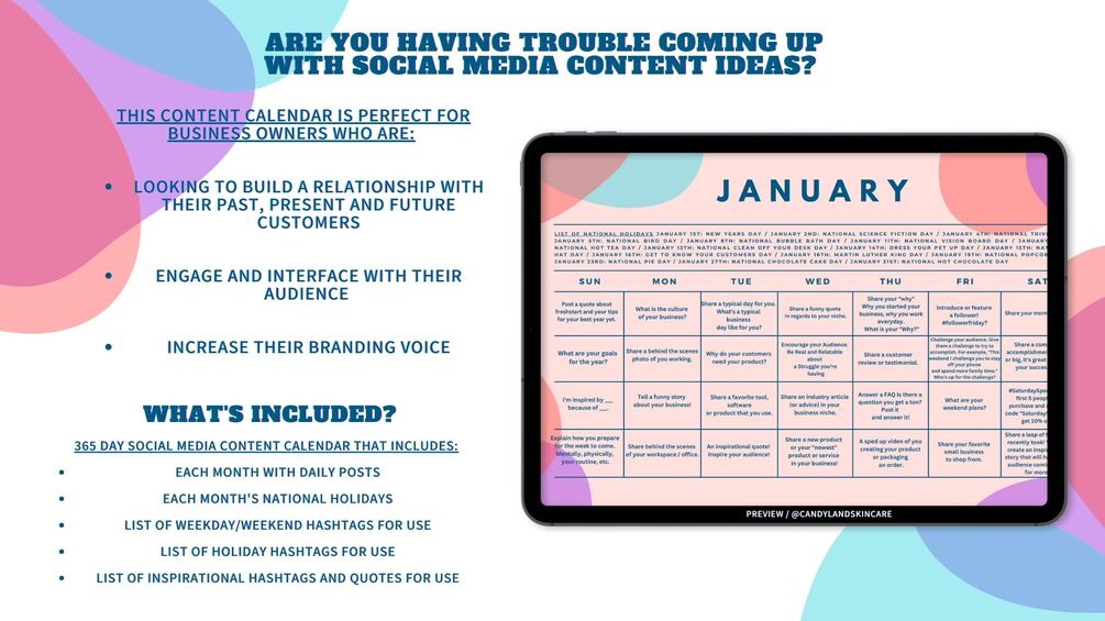 365 Day Social Media Content Calendar that includes: Each Month with Daily Posts / Each Month's National Holidays / List of weekday & weekend Hashtags for use / list of holiday hashtags for use / list of inspirational hashtags and Quotes for use